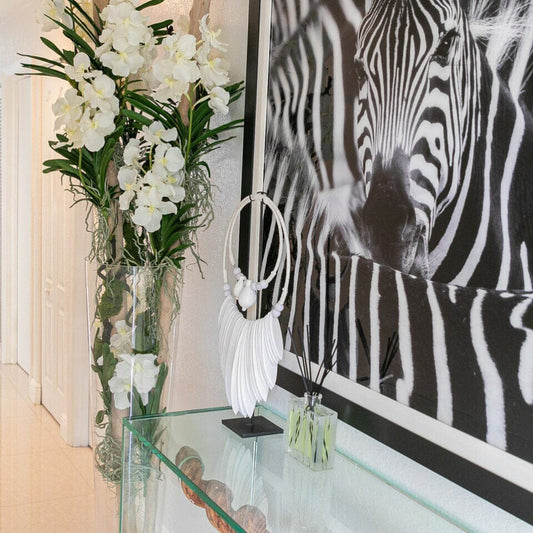 White Vanda Orchids and Driftwood Inside a Large Conical Glass Cylinder