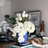Inca Vase featuring a stunning striped pattern, beautifully complemented by a mixed bouquet of white orchids, hydrangeas, tulips, and star palm leaves. Perfect for adding a touch of elegance and sophistication to any space.