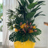 Bring the vibrant beauty of the tropics into your home with our stunning mix of tropical plants. Featuring lush bird of paradise, raffia palm, fern, monstera leaves, and bright yellow bromeliads, this arrangement is designed to captivate.
